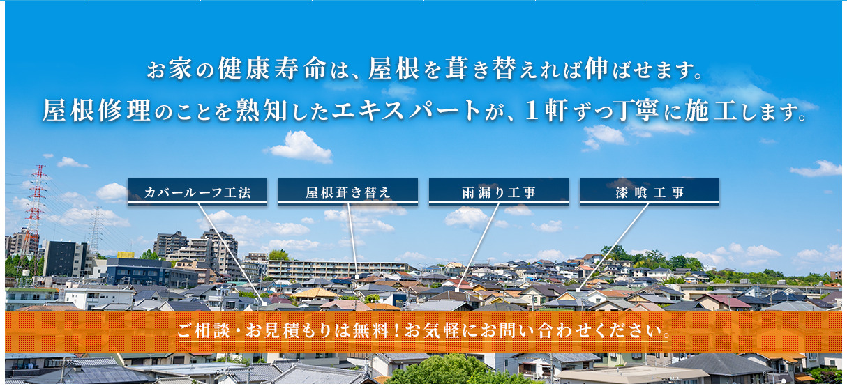 岡山県一円の戸建て住宅や屋根付きの店舗などを対象に屋根工事や雨漏り工事を行っており、1軒ずつ状態を見極めながら、最も効果が高い工法を選びます。